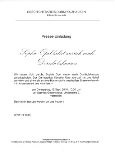 In ihrer Ausgaben vom 16.09.2016 berichtete die Taunus-Zeitung unter dem Titel "Sophie Opel kehrt zurück" über die Terracotta-Büste der Sophie Opel in Dornholzhausen