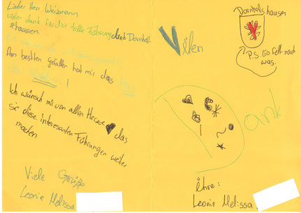 Leider können wir hier nicht alle Zuschriften abbilden, obwohl sie uns alle begeistert haben. Stellvertretend möchten wir jedoch zeigen, was Benedikt, Leo, Leonie Melissa und Michelle geschrieben und gezeichnet haben.